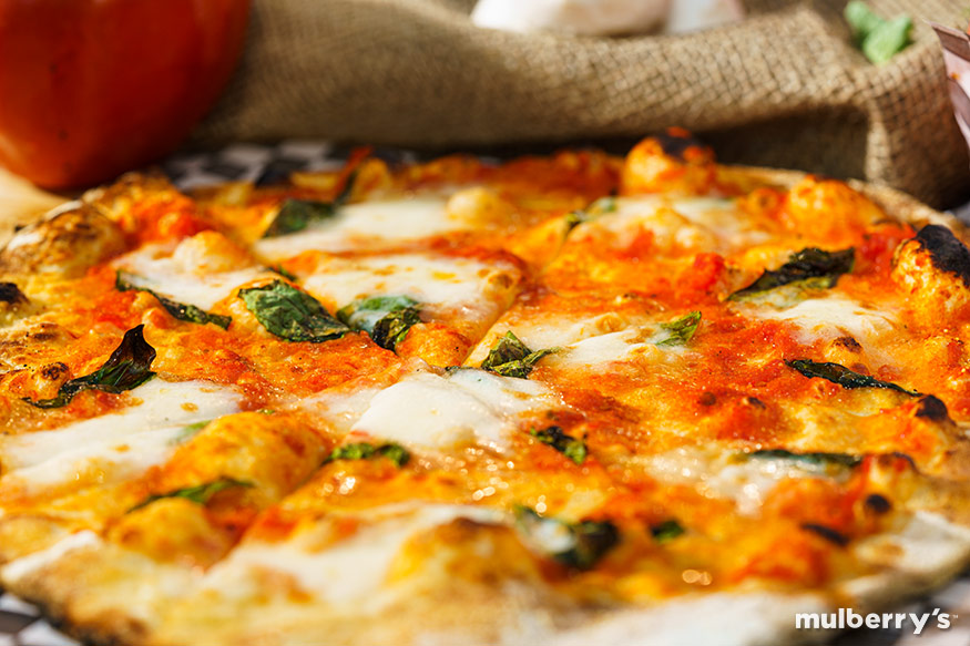 Mulberry’s makes a Neapolitan-style pizza that has a very thin and crispy crust, with a delicate, crunchy outer rim and is baked in our oven for 90 - 120 seconds.
